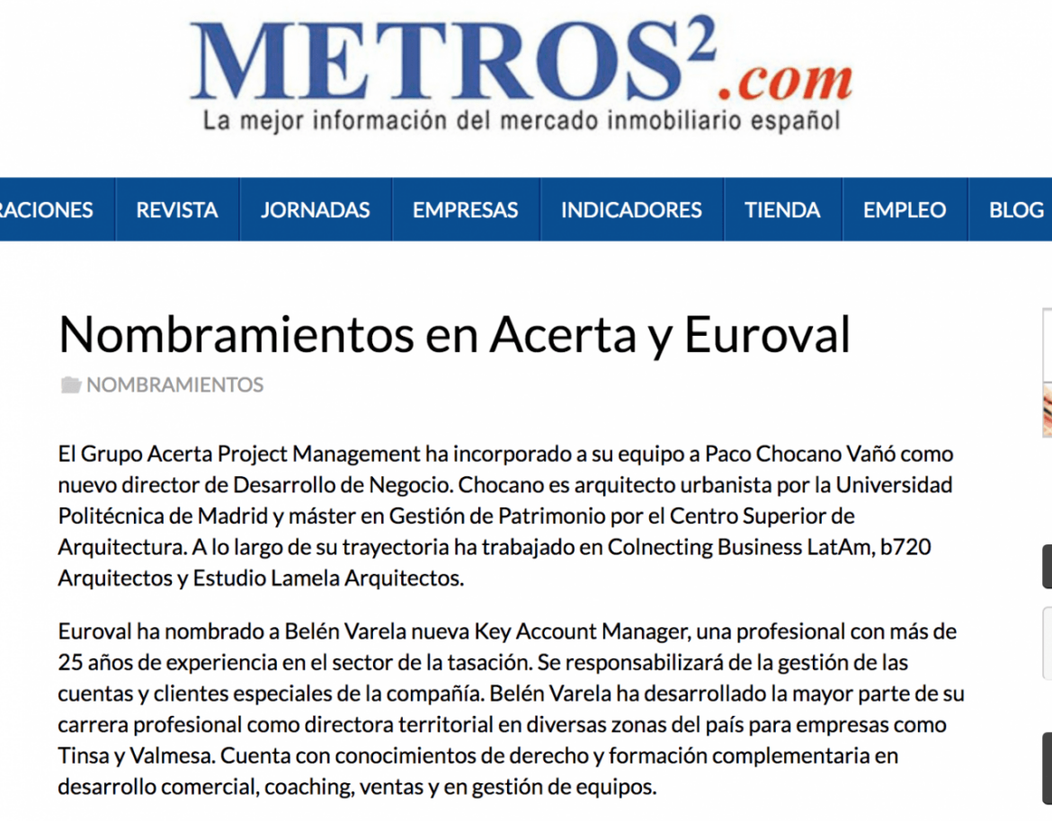 El Grupo Acerta Project Management ha incorporado a su equipo a Paco Chocano Vañó como nuevo director de Desarrollo de Negocio. Chocano es arquitecto urbanista por la Universidad Politécnica de Madrid y máster en Gestión de Patrimonio por el Centro Superior de Arquitectura. A lo largo de su trayectoria ha trabajado en Colnecting Business LatAm, b720 Arquitectos y Estudio Lamela Arquitectos.