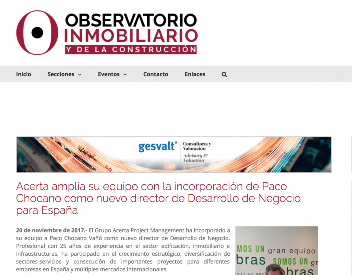 El Grupo Acerta Project Management ha incorporado a su equipo a Paco Chocano Vañó como nuevo director de Desarrollo de Negocio. Profesional con 25 años de experiencia en el sector edificación, inmobiliario e infraestructuras, ha participado en el crecimiento estratégico, diversificación de sectores-servicios y consecución de importantes proyectos para diferentes empresas en España y múltiples mercados internacionales.